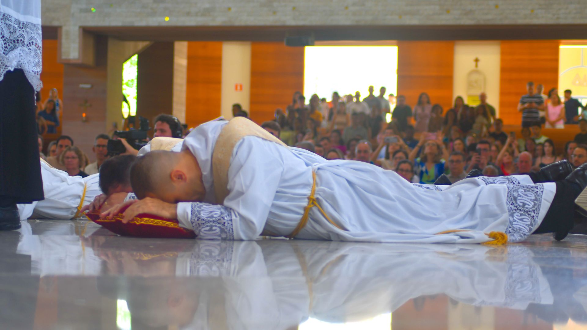Rito de ordenação presbiteral, bispo em pé e futuros sacerdotes ajoelhados.