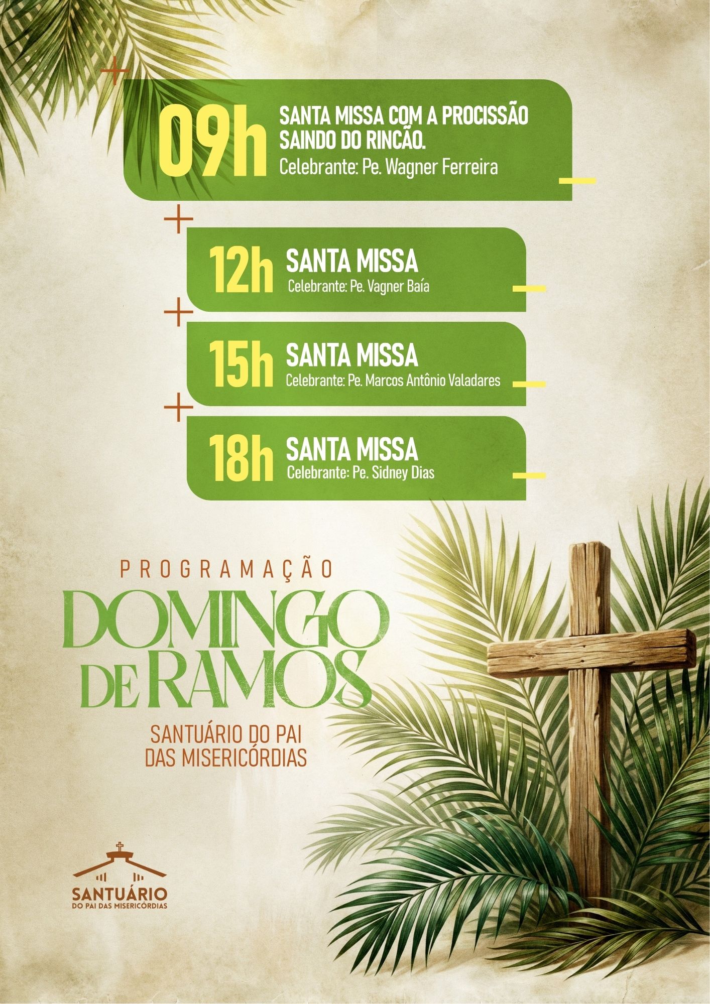 A celebração do Domingo de Ramos, no próximo dia 29 de março, abre solenemente a programação da Semana Santa no Santuário do Pai das Misericórdias. Com a tradicional procissão de Ramos, a missa das 09h terá início no Rincão do meu Senhor em direção ao Santuário. Essa celebração será presidida por Padre Wagner Ferreira, presidente da Comunidade Canção Nova.